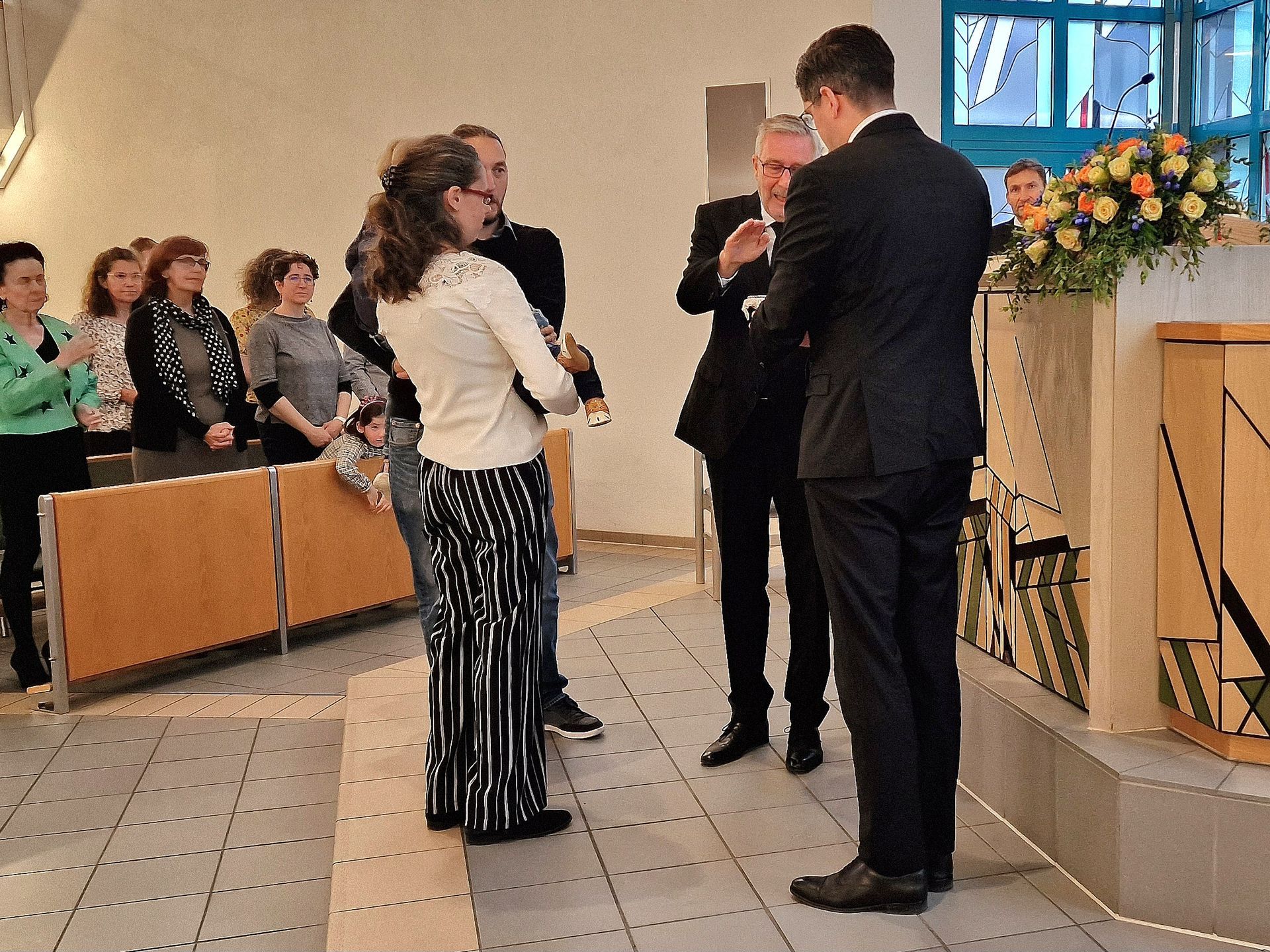 20.09.2025 | Unser Hirte Heiko und seine Kerstin haben geheiratet - kirchlich in unserer Kirche in Giesing. Die Trauung führte unsere Bezirksvorsteher Angermann durch, musikalisch umrahmt von Orchester, Violinen-Trio, Chor, Orgel und Eingangslied der Gemeinde. Chor | SdH 12 Lass Du mich stille werden Orchester | 268 Eingangslied Gemeinde | B256a Nun danken alle Gott Chor | 206 Ich hebe meine Augen auf Violinen-Trio Orchester | Schafe können sicher weiden Nach der Zeromonie hat die ganze Gemeinde zusammen die Hochzeit gefeiert. Herzlich Dank dafür an alle Beteiligten, für Aufbau, Organisation, Abbau, usw. . Liebe Kerstin & lieber Heiko, wir wünschen Euch alles erdenklich Liebe zur Hochzeit, dass der himmlische Vater stets Euch behüte und beschütze. Es ist schön, Euch in unserer Mitte zu haben. (SwH) > Zur Bildergalerie